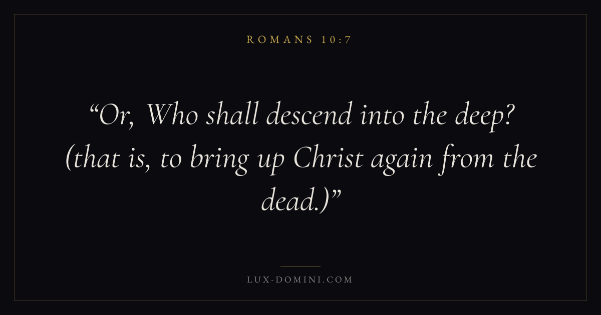 Books / Romans / Chapter 10 / Verse 7 ← Romans 10:6 Romans 10:7 Romans 10:8 → Or, Who shall descend into the deep? (that is, to bring up Christ again from the dead.) Download verse card Share on Twitter Share on Facebook Pin it ✦ Key themes FaithHopeGraceTruthJustification Read with Romans 10:6Romans 10:8Hebrews 11:1Romans 10:17 Related topics Bible verses about faithBible verses about hopeBible verses about graceBible verses about truth ✦ Romans Chapter 10 verses V. 1 V. 2 V. 3 V. 4 V. 5 V. 6 V. 7 V. 8 V. 9 V. 10 V. 11 V. 12 V. 13 V. 14 V. 15 V. 16 V. 17 V. 18 V. 19 V. 20 V. 21