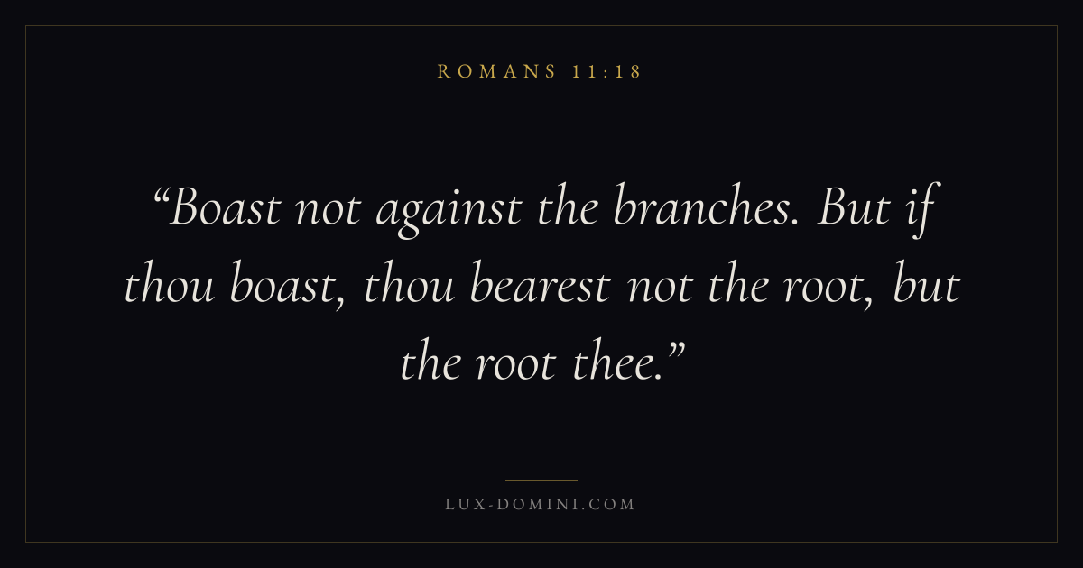 Books / Romans / Chapter 11 / Verse 18 ← Romans 11:17 Romans 11:18 Romans 11:19 → Boast not against the branches. But if thou boast, thou bearest not the root, but the root thee. Download verse card Share on Twitter Share on Facebook Pin it ✦ Key themes FaithGraceJustificationSin Read with Romans 11:19Hebrews 11:1Romans 10:17Ephesians 2:8 Related topics Bible verses about faithBible verses about graceBible verses about sin ✦ Romans Chapter 11 verses V. 1 V. 2 V. 3 V. 4 V. 5 V. 6 V. 7 V. 8 V. 9 V. 10 V. 11 V. 12 V. 13 V. 14 V. 15 V. 16 V. 17 V. 18 V. 19 V. 20 V. 21 V. 22 V. 23 V. 24 V. 25 V. 26 V. 27 V. 28 V. 29 V. 30 V. 31 V. 32 V. 33 V. 34 V. 35 V. 36