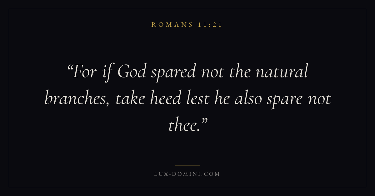 Books / Romans / Chapter 11 / Verse 21 ← Romans 11:20 Romans 11:21 Romans 11:22 → For if God spared not the natural branches, take heed lest he also spare not thee. Download verse card Share on Twitter Share on Facebook Pin it ✦ Key themes FaithGraceJustificationSin Read with Romans 11:20Hebrews 11:1Romans 10:17Ephesians 2:8 Related topics Bible verses about faithBible verses about graceBible verses about sin ✦ Romans Chapter 11 verses V. 1 V. 2 V. 3 V. 4 V. 5 V. 6 V. 7 V. 8 V. 9 V. 10 V. 11 V. 12 V. 13 V. 14 V. 15 V. 16 V. 17 V. 18 V. 19 V. 20 V. 21 V. 22 V. 23 V. 24 V. 25 V. 26 V. 27 V. 28 V. 29 V. 30 V. 31 V. 32 V. 33 V. 34 V. 35 V. 36