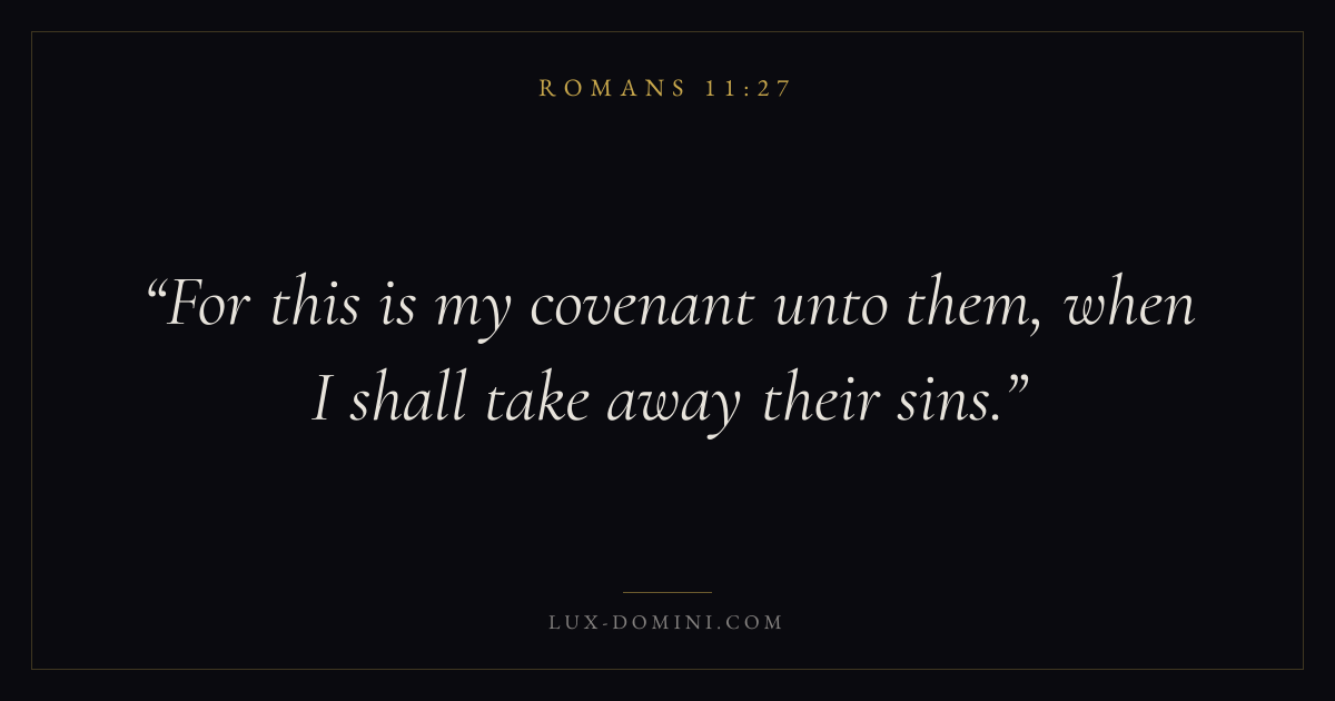 Books / Romans / Chapter 11 / Verse 27 ← Romans 11:26 Romans 11:27 Romans 11:28 → For this is my covenant unto them, when I shall take away their sins. Download verse card Share on Twitter Share on Facebook Pin it ✦ Key themes FaithGraceJustificationSin Read with Romans 11:25Romans 11:26Hebrews 11:1Romans 10:17 Related topics Bible verses about faithBible verses about graceBible verses about sin ✦ Romans Chapter 11 verses V. 1 V. 2 V. 3 V. 4 V. 5 V. 6 V. 7 V. 8 V. 9 V. 10 V. 11 V. 12 V. 13 V. 14 V. 15 V. 16 V. 17 V. 18 V. 19 V. 20 V. 21 V. 22 V. 23 V. 24 V. 25 V. 26 V. 27 V. 28 V. 29 V. 30 V. 31 V. 32 V. 33 V. 34 V. 35 V. 36