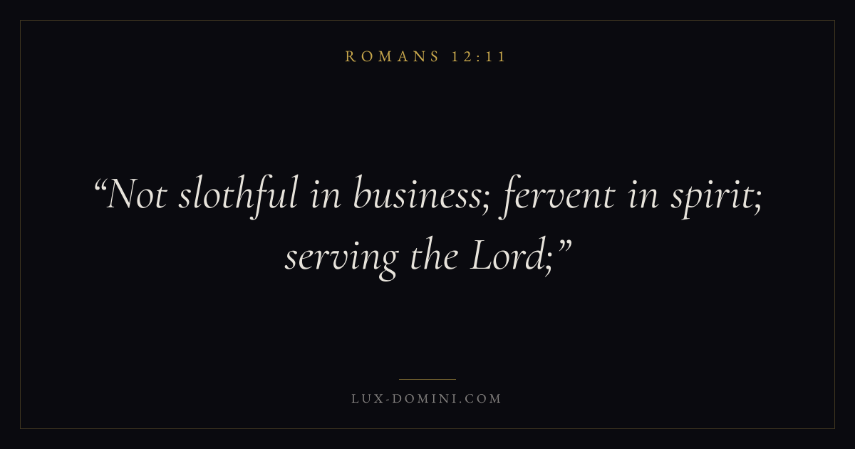 Books / Romans / Chapter 12 / Verse 11 ← Romans 12:10 Romans 12:11 Romans 12:12 → Not slothful in business; fervent in spirit; serving the Lord; Download verse card Share on Twitter Share on Facebook Pin it ✦ Key themes LoveFaithGraceJustification Read with Romans 12:9Romans 12:10John 3:161 Corinthians 13:4 Related topics Bible verses about loveBible verses about faithBible verses about grace ✦ Romans Chapter 12 verses V. 1 V. 2 V. 3 V. 4 V. 5 V. 6 V. 7 V. 8 V. 9 V. 10 V. 11 V. 12 V. 13 V. 14 V. 15 V. 16 V. 17 V. 18 V. 19 V. 20 V. 21