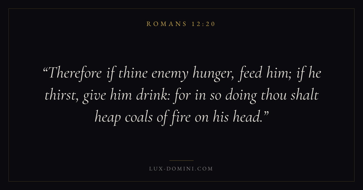 Therefore if thine enemy hunger, feed him; if he thirst, give him drink: for in so doing thou shalt heap coals of fire on his head.