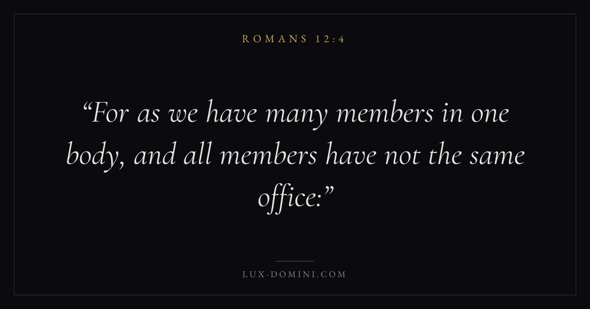 Books / Romans / Chapter 12 / Verse 4 ← Romans 12:3 Romans 12:4 Romans 12:5 → For as we have many members in one body, and all members have not the same office: Download verse card Share on Twitter Share on Facebook Pin it ✦ Key themes FaithGraceHumilityJustification Read with Romans 12:3Romans 12:5Hebrews 11:1Romans 10:17 Related topics Bible verses about faithBible verses about graceBible verses about humility ✦ Romans Chapter 12 verses V. 1 V. 2 V. 3 V. 4 V. 5 V. 6 V. 7 V. 8 V. 9 V. 10 V. 11 V. 12 V. 13 V. 14 V. 15 V. 16 V. 17 V. 18 V. 19 V. 20 V. 21