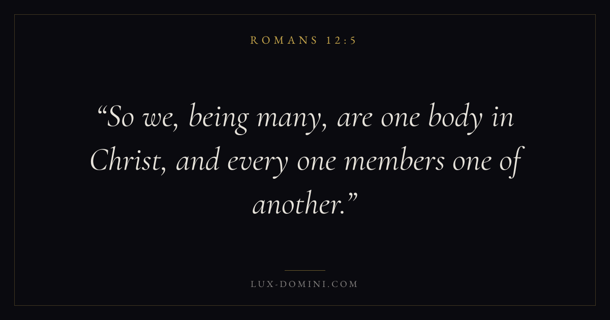 Books / Romans / Chapter 12 / Verse 5 ← Romans 12:4 Romans 12:5 Romans 12:6 → So we, being many, are one body in Christ, and every one members one of another. Download verse card Share on Twitter Share on Facebook Pin it ✦ Key themes FaithGraceHumilityJustification Read with Romans 12:3Romans 12:4Hebrews 11:1Romans 10:17 Related topics Bible verses about faithBible verses about graceBible verses about humility ✦ Romans Chapter 12 verses V. 1 V. 2 V. 3 V. 4 V. 5 V. 6 V. 7 V. 8 V. 9 V. 10 V. 11 V. 12 V. 13 V. 14 V. 15 V. 16 V. 17 V. 18 V. 19 V. 20 V. 21