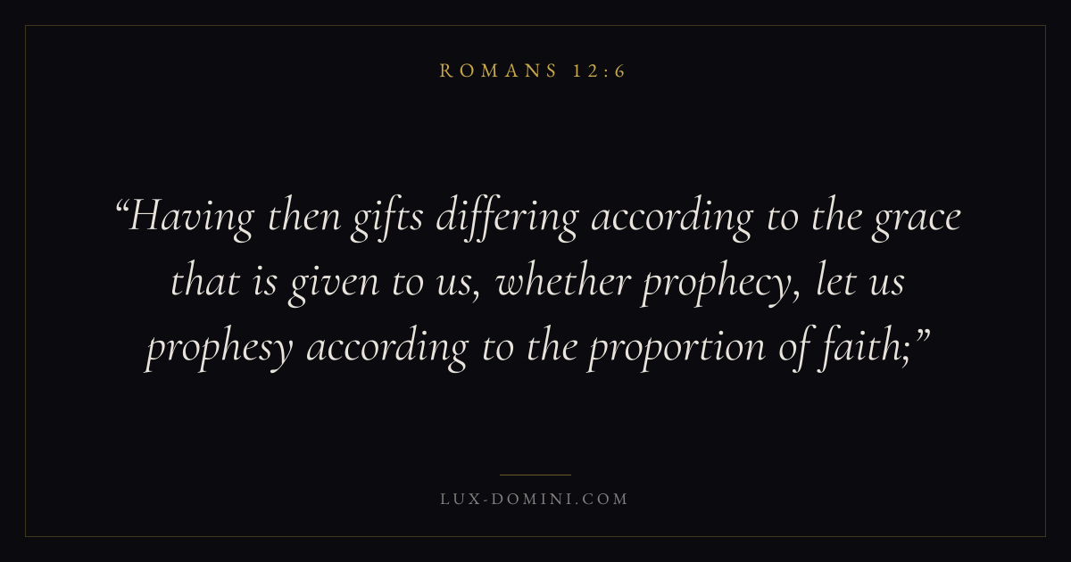 Having then gifts differing according to the grace that is given to us, whether prophecy, let us prophesy according to the proportion of faith;