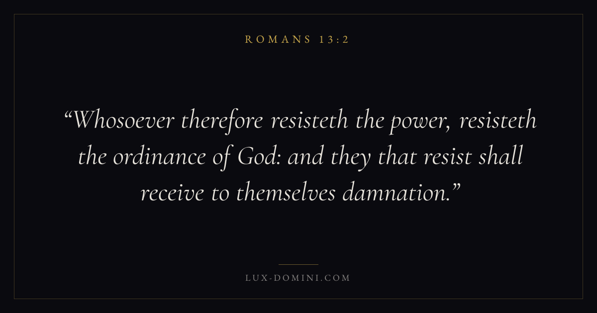 Whosoever therefore resisteth the power, resisteth the ordinance of God: and they that resist shall receive to themselves damnation.