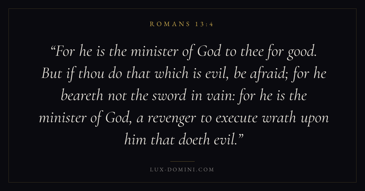 For he is the minister of God to thee for good. But if thou do that which is evil, be afraid; for he beareth not the sword in vain: for he is the minister of God, a revenger to execute wrath upon him that doeth evil.