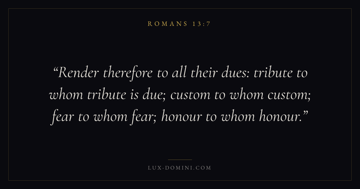 Render therefore to all their dues: tribute to whom tribute is due; custom to whom custom; fear to whom fear; honour to whom honour.