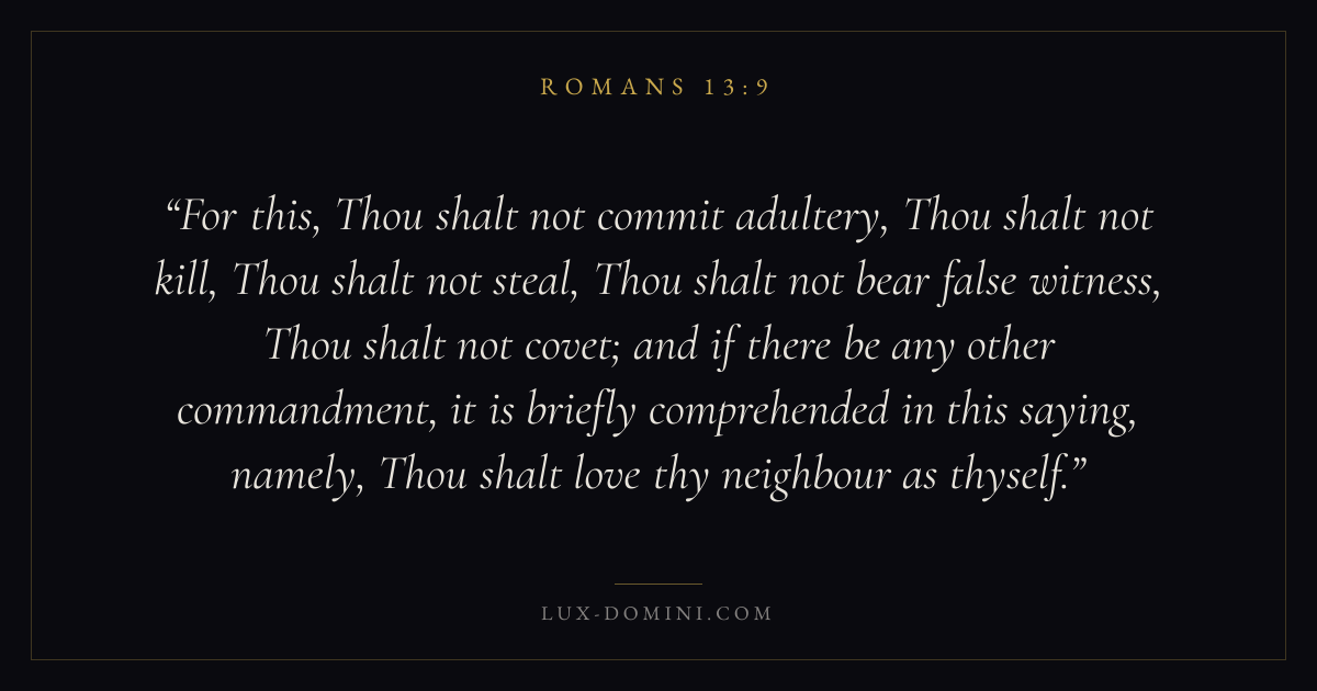 For this, Thou shalt not commit adultery, Thou shalt not kill, Thou shalt not steal, Thou shalt not bear false witness, Thou shalt not covet; and if there be any other commandment, it is briefly comprehended in this saying, namely, Thou shalt love thy neighbour as thyself.