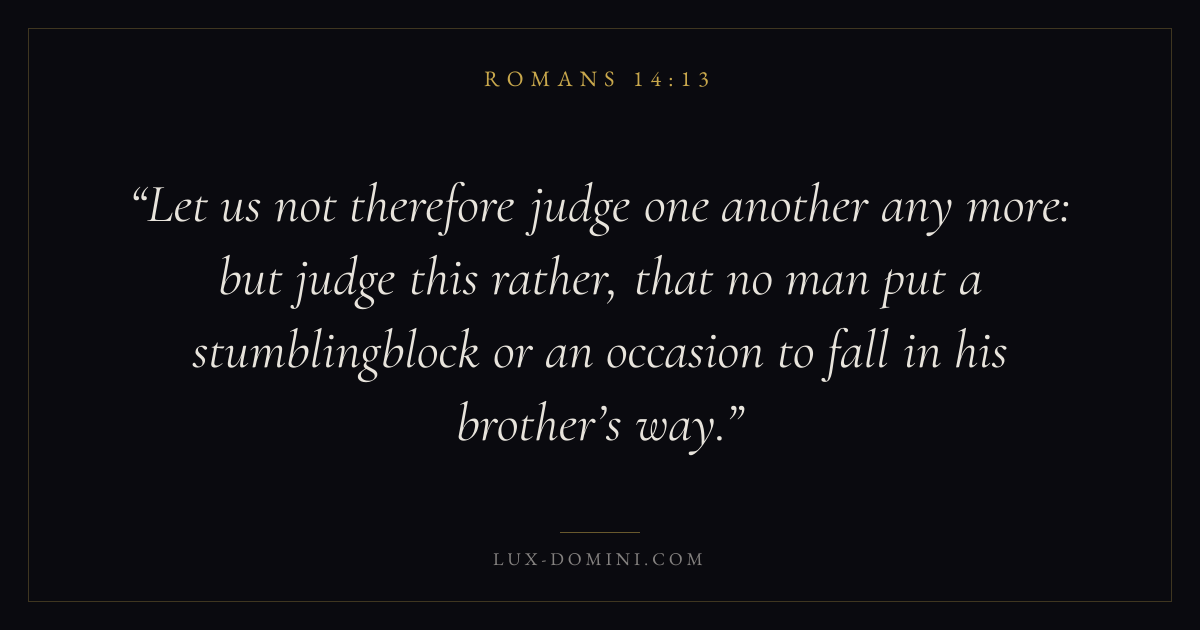 Let us not therefore judge one another any more: but judge this rather, that no man put a stumblingblock or an occasion to fall in his brother’s way.