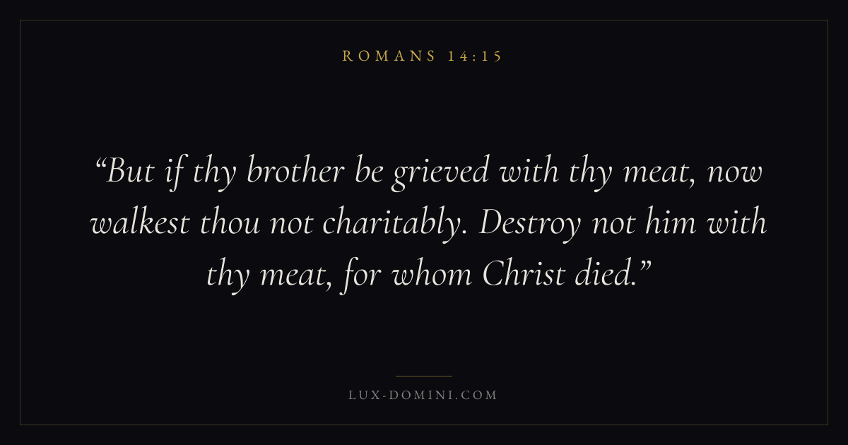 But if thy brother be grieved with thy meat, now walkest thou not charitably. Destroy not him with thy meat, for whom Christ died.