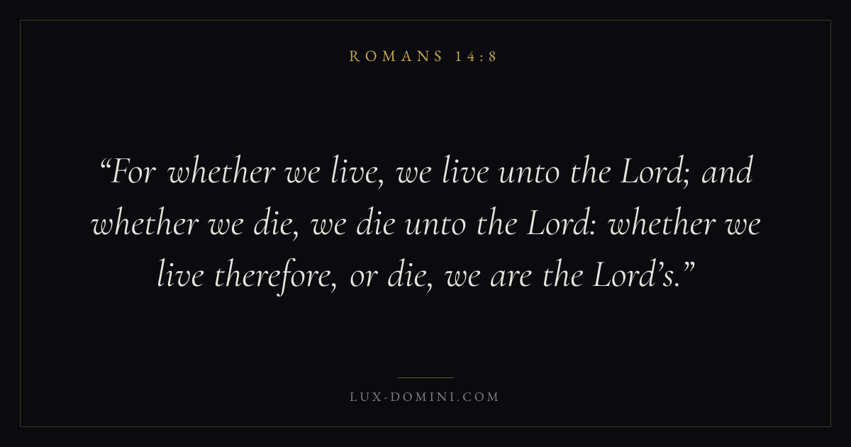 For whether we live, we live unto the Lord; and whether we die, we die unto the Lord: whether we live therefore, or die, we are the Lord’s.