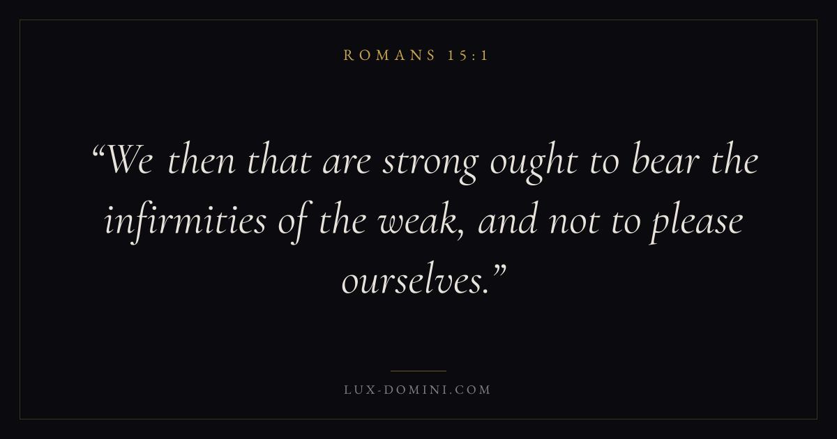 Books / Romans / Chapter 15 / Verse 1 ← Romans 14:23 Romans 15:1 Romans 15:2 → We then that are strong ought to bear the infirmities of the weak, and not to please ourselves. Download verse card Share on Twitter Share on Facebook Pin it ✦ Key themes FaithGraceJustificationSin Read with Hebrews 11:1Romans 10:17Ephesians 2:82 Corinthians 12:9 Related topics Bible verses about faithBible verses about graceBible verses about sin ✦ Romans Chapter 15 verses V. 1 V. 2 V. 3 V. 4 V. 5 V. 6 V. 7 V. 8 V. 9 V. 10 V. 11 V. 12 V. 13 V. 14 V. 15 V. 16 V. 17 V. 18 V. 19 V. 20 V. 21 V. 22 V. 23 V. 24 V. 25 V. 26 V. 27 V. 28 V. 29 V. 30 V. 31 V. 32 V. 33