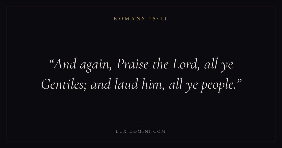 Books / Romans / Chapter 15 / Verse 11 ← Romans 15:10 Romans 15:11 Romans 15:12 → And again, Praise the Lord, all ye Gentiles; and laud him, all ye people. Download verse card Share on Twitter Share on Facebook Pin it ✦ Key themes FaithSuffering and trialsGraceJustification Read with Romans 15:7Romans 15:8Hebrews 11:1Romans 10:17 Related topics Bible verses about faithBible verses about suffering and trialsBible verses about grace ✦ Romans Chapter 15 verses V. 1 V. 2 V. 3 V. 4 V. 5 V. 6 V. 7 V. 8 V. 9 V. 10 V. 11 V. 12 V. 13 V. 14 V. 15 V. 16 V. 17 V. 18 V. 19 V. 20 V. 21 V. 22 V. 23 V. 24 V. 25 V. 26 V. 27 V. 28 V. 29 V. 30 V. 31 V. 32 V. 33