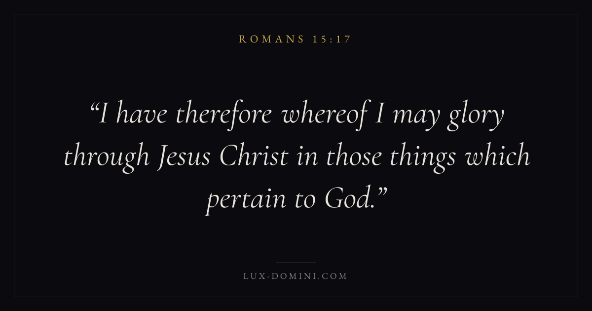 Books / Romans / Chapter 15 / Verse 17 ← Romans 15:16 Romans 15:17 Romans 15:18 → I have therefore whereof I may glory through Jesus Christ in those things which pertain to God. Download verse card Share on Twitter Share on Facebook Pin it ✦ Key themes FaithWisdomGraceJustification Read with Romans 15:18Romans 15:19Hebrews 11:1Romans 10:17 Related topics Bible verses about faithBible verses about wisdomBible verses about grace ✦ Romans Chapter 15 verses V. 1 V. 2 V. 3 V. 4 V. 5 V. 6 V. 7 V. 8 V. 9 V. 10 V. 11 V. 12 V. 13 V. 14 V. 15 V. 16 V. 17 V. 18 V. 19 V. 20 V. 21 V. 22 V. 23 V. 24 V. 25 V. 26 V. 27 V. 28 V. 29 V. 30 V. 31 V. 32 V. 33