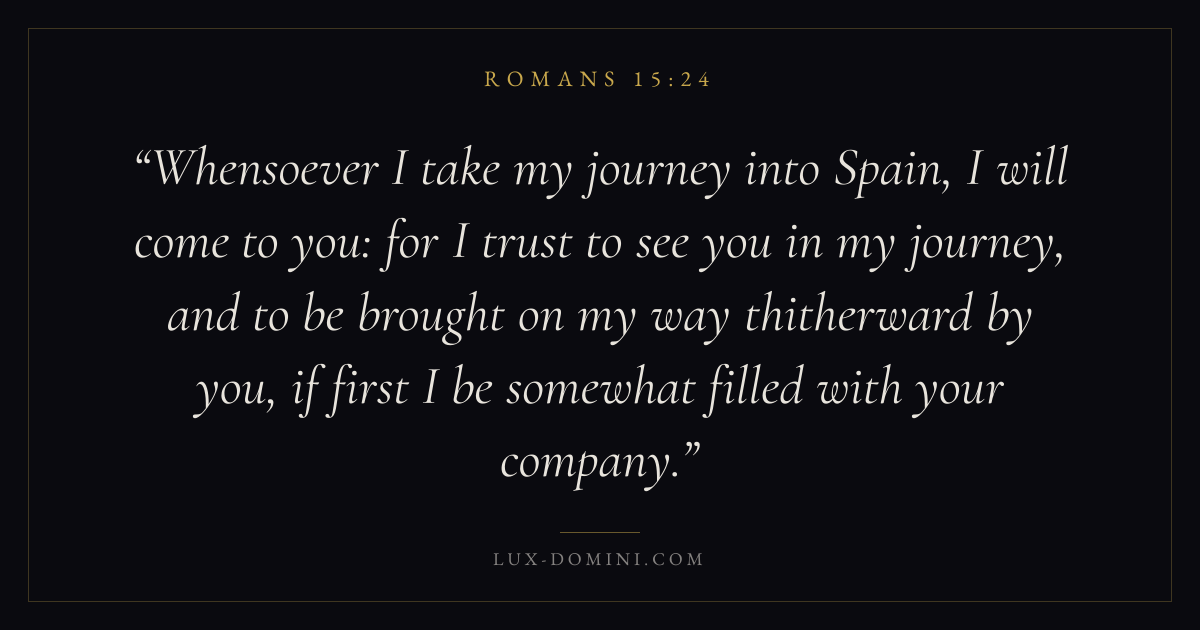 Whensoever I take my journey into Spain, I will come to you: for I trust to see you in my journey, and to be brought on my way thitherward by you, if first I be somewhat filled with your company.