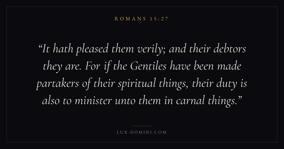 It hath pleased them verily; and their debtors they are. For if the Gentiles have been made partakers of their spiritual things, their duty is also to minister unto them in carnal things.