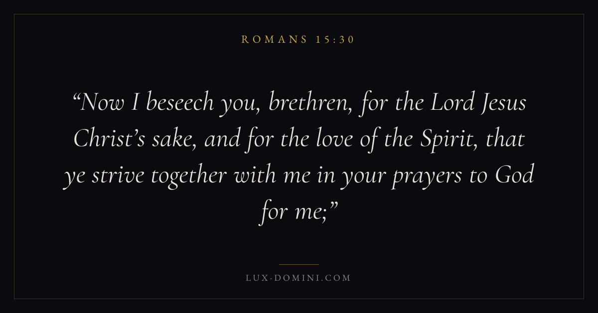 Now I beseech you, brethren, for the Lord Jesus Christ’s sake, and for the love of the Spirit, that ye strive together with me in your prayers to God for me;