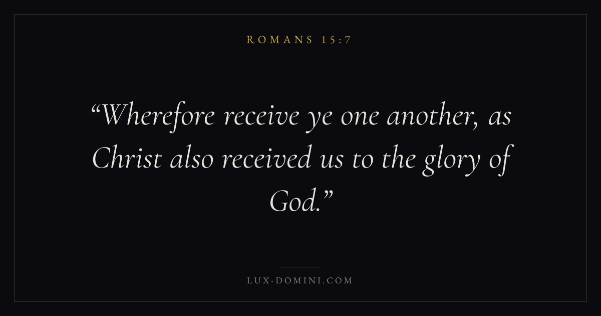 Books / Romans / Chapter 15 / Verse 7 ← Romans 15:6 Romans 15:7 Romans 15:8 → Wherefore receive ye one another, as Christ also received us to the glory of God. Download verse card Share on Twitter Share on Facebook Pin it ✦ Key themes FaithGraceJustificationSin Read with Romans 15:8Romans 15:9Hebrews 11:1Romans 10:17 Related topics Bible verses about faithBible verses about graceBible verses about sin ✦ Romans Chapter 15 verses V. 1 V. 2 V. 3 V. 4 V. 5 V. 6 V. 7 V. 8 V. 9 V. 10 V. 11 V. 12 V. 13 V. 14 V. 15 V. 16 V. 17 V. 18 V. 19 V. 20 V. 21 V. 22 V. 23 V. 24 V. 25 V. 26 V. 27 V. 28 V. 29 V. 30 V. 31 V. 32 V. 33
