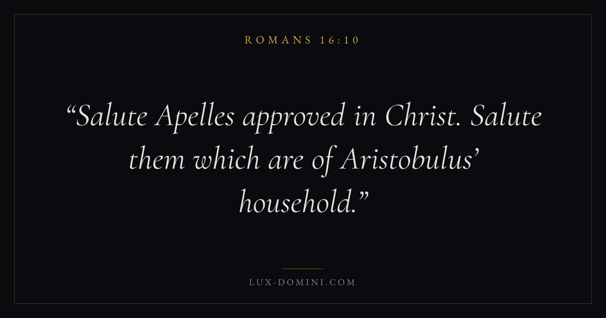 Books / Romans / Chapter 16 / Verse 10 ← Romans 16:9 Romans 16:10 Romans 16:11 → Salute Apelles approved in Christ. Salute them which are of Aristobulus’ household. Download verse card Share on Twitter Share on Facebook Pin it ✦ Key themes FaithGraceJustificationSin Read with Romans 16:9Hebrews 11:1Romans 10:17Ephesians 2:8 Related topics Bible verses about faithBible verses about graceBible verses about sin ✦ Romans Chapter 16 verses V. 1 V. 2 V. 3 V. 4 V. 5 V. 6 V. 7 V. 8 V. 9 V. 10 V. 11 V. 12 V. 13 V. 14 V. 15 V. 16 V. 17 V. 18 V. 19 V. 20 V. 21 V. 22 V. 23 V. 24 V. 25 V. 26 V. 27