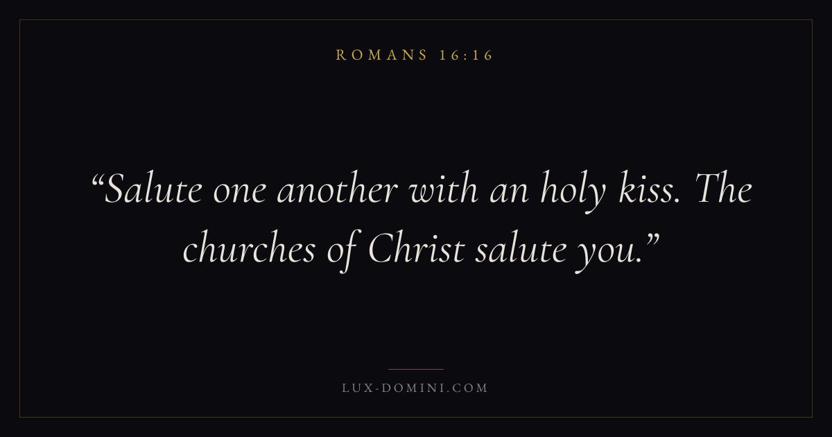 Books / Romans / Chapter 16 / Verse 16 ← Romans 16:15 Romans 16:16 Romans 16:17 → Salute one another with an holy kiss. The churches of Christ salute you. Download verse card Share on Twitter Share on Facebook Pin it ✦ Key themes FaithGraceJustificationSin Read with Romans 16:15Hebrews 11:1Romans 10:17Ephesians 2:8 Related topics Bible verses about faithBible verses about graceBible verses about sin ✦ Romans Chapter 16 verses V. 1 V. 2 V. 3 V. 4 V. 5 V. 6 V. 7 V. 8 V. 9 V. 10 V. 11 V. 12 V. 13 V. 14 V. 15 V. 16 V. 17 V. 18 V. 19 V. 20 V. 21 V. 22 V. 23 V. 24 V. 25 V. 26 V. 27
