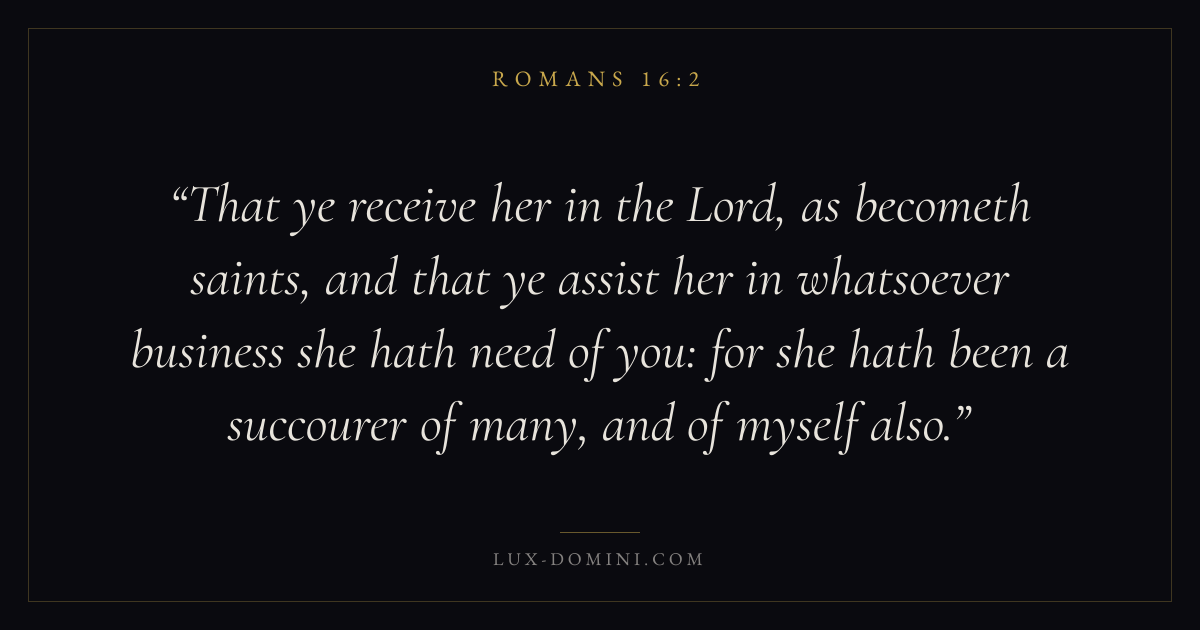 That ye receive her in the Lord, as becometh saints, and that ye assist her in whatsoever business she hath need of you: for she hath been a succourer of many, and of myself also.