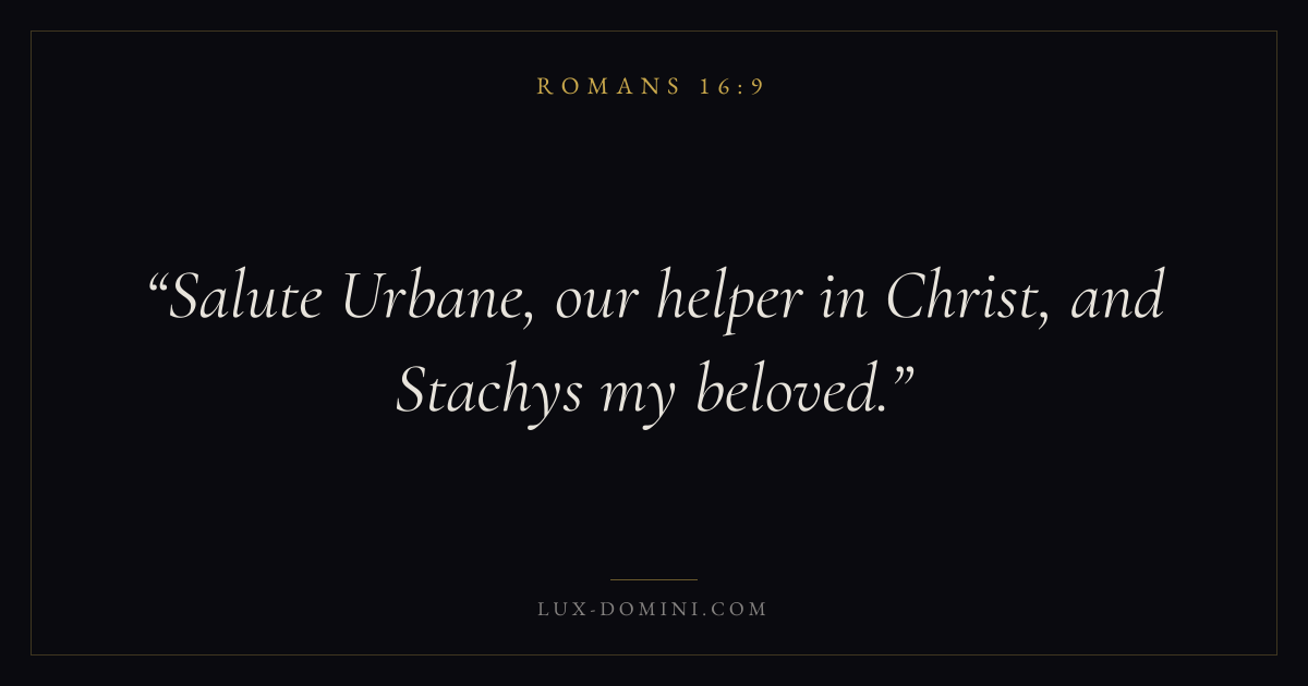 Books / Romans / Chapter 16 / Verse 9 ← Romans 16:8 Romans 16:9 Romans 16:10 → Salute Urbane, our helper in Christ, and Stachys my beloved. Download verse card Share on Twitter Share on Facebook Pin it ✦ Key themes LoveFaithGraceJustification Read with Romans 16:10John 3:161 Corinthians 13:4Hebrews 11:1 Related topics Bible verses about loveBible verses about faithBible verses about grace ✦ Romans Chapter 16 verses V. 1 V. 2 V. 3 V. 4 V. 5 V. 6 V. 7 V. 8 V. 9 V. 10 V. 11 V. 12 V. 13 V. 14 V. 15 V. 16 V. 17 V. 18 V. 19 V. 20 V. 21 V. 22 V. 23 V. 24 V. 25 V. 26 V. 27
