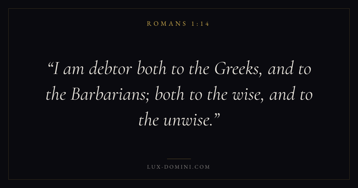 Books / Romans / Chapter 1 / Verse 14 ← Romans 1:13 Romans 1:14 Romans 1:15 → I am debtor both to the Greeks, and to the Barbarians; both to the wise, and to the unwise. Download verse card Share on Twitter Share on Facebook Pin it ✦ Key themes LoveFaithWisdomGraceJustification Read with Romans 1:13Romans 1:15John 3:161 Corinthians 13:4 Related topics Bible verses about loveBible verses about faithBible verses about wisdomBible verses about grace ✦ Romans Chapter 1 verses V. 1 V. 2 V. 3 V. 4 V. 5 V. 6 V. 7 V. 8 V. 9 V. 10 V. 11 V. 12 V. 13 V. 14 V. 15 V. 16 V. 17 V. 18 V. 19 V. 20 V. 21 V. 22 V. 23 V. 24 V. 25 V. 26 V. 27 V. 28 V. 29 V. 30 V. 31 V. 32