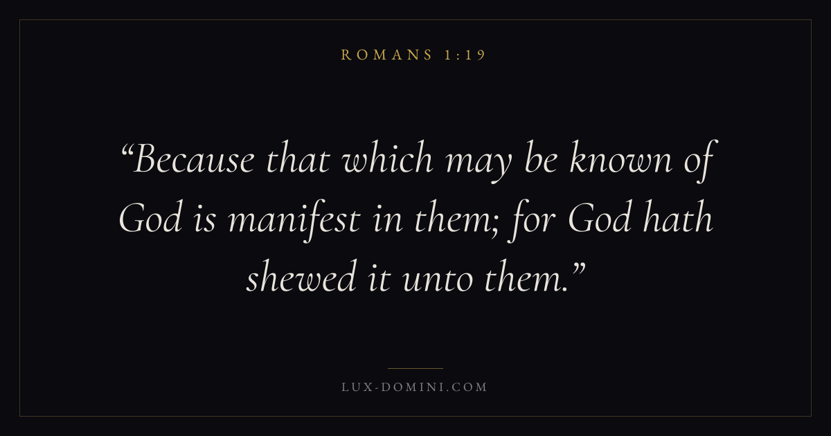 Books / Romans / Chapter 1 / Verse 19 ← Romans 1:18 Romans 1:19 Romans 1:20 → Because that which may be known of God is manifest in them; for God hath shewed it unto them. Download verse card Share on Twitter Share on Facebook Pin it ✦ Key themes FaithSalvationGraceJustification Read with Romans 1:18Romans 1:20Hebrews 11:1Romans 10:17 Related topics Bible verses about faithBible verses about salvationBible verses about grace ✦ Romans Chapter 1 verses V. 1 V. 2 V. 3 V. 4 V. 5 V. 6 V. 7 V. 8 V. 9 V. 10 V. 11 V. 12 V. 13 V. 14 V. 15 V. 16 V. 17 V. 18 V. 19 V. 20 V. 21 V. 22 V. 23 V. 24 V. 25 V. 26 V. 27 V. 28 V. 29 V. 30 V. 31 V. 32