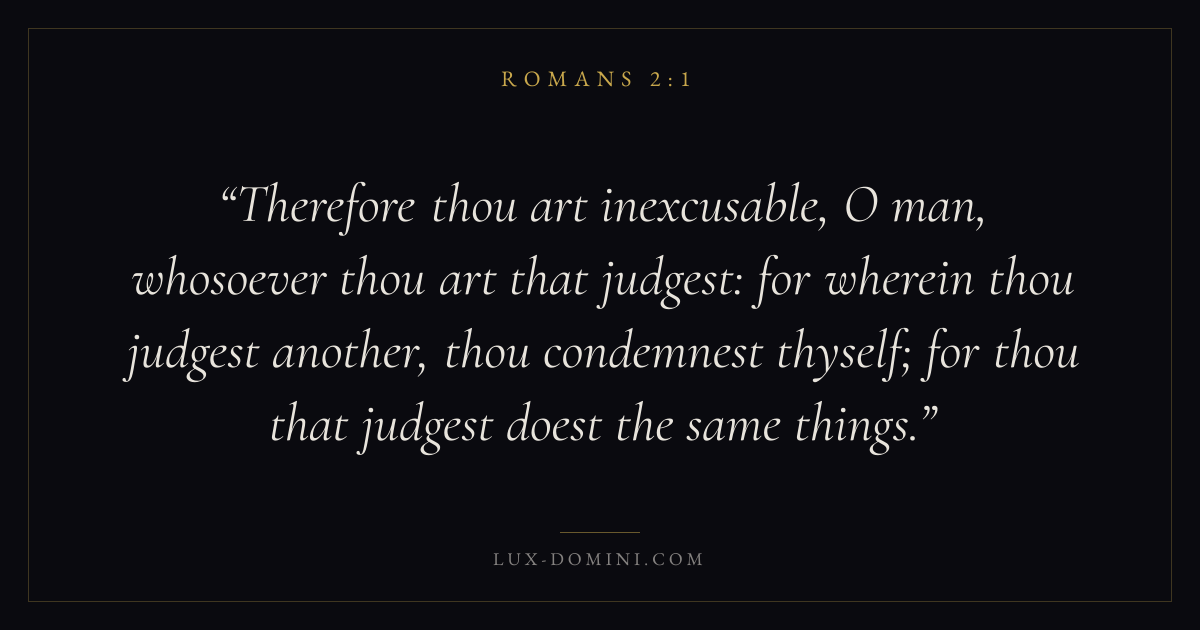 Therefore thou art inexcusable, O man, whosoever thou art that judgest: for wherein thou judgest another, thou condemnest thyself; for thou that judgest doest the same things.