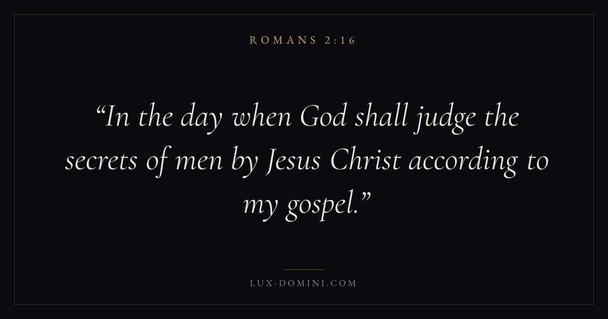 Books / Romans / Chapter 2 / Verse 16 ← Romans 2:15 Romans 2:16 Romans 2:17 → In the day when God shall judge the secrets of men by Jesus Christ according to my gospel. Download verse card Share on Twitter Share on Facebook Pin it ✦ Key themes FaithJustice and mercyGraceJustification Read with Hebrews 11:1Romans 10:17Micah 6:8Amos 5:24 Related topics Bible verses about faithBible verses about justice and mercyBible verses about grace ✦ Romans Chapter 2 verses V. 1 V. 2 V. 3 V. 4 V. 5 V. 6 V. 7 V. 8 V. 9 V. 10 V. 11 V. 12 V. 13 V. 14 V. 15 V. 16 V. 17 V. 18 V. 19 V. 20 V. 21 V. 22 V. 23 V. 24 V. 25 V. 26 V. 27 V. 28 V. 29