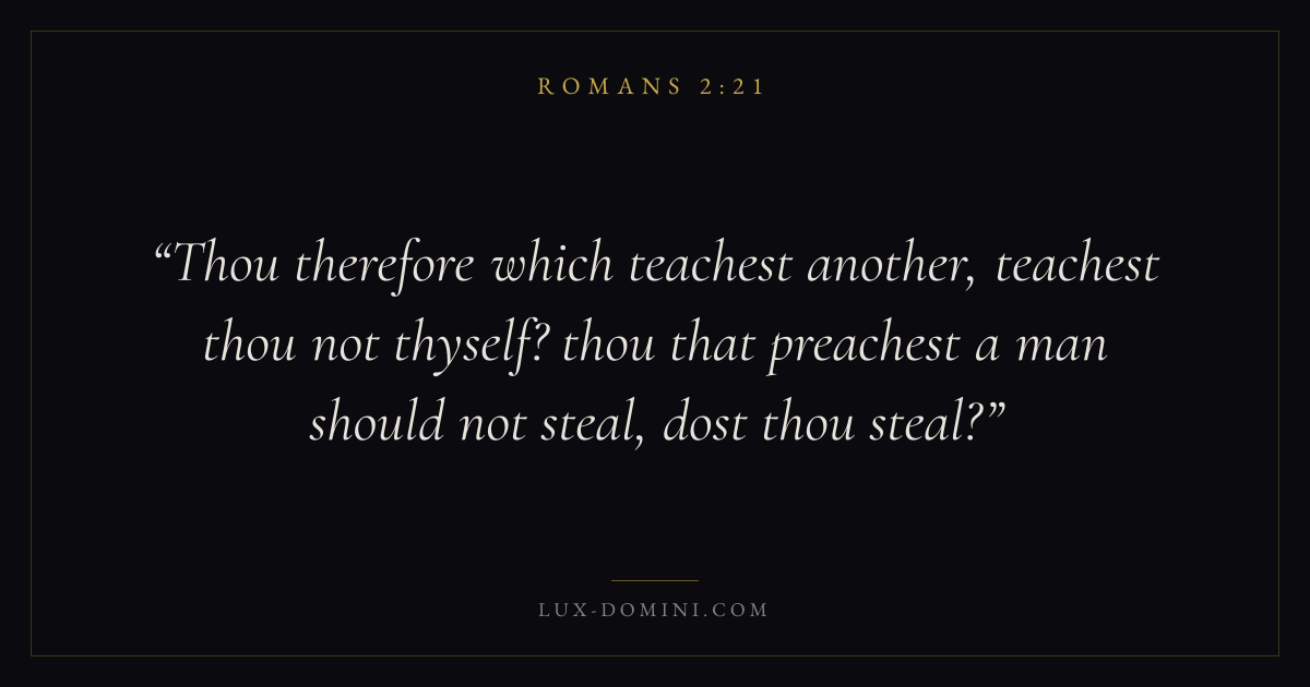 Thou therefore which teachest another, teachest thou not thyself? thou that preachest a man should not steal, dost thou steal?