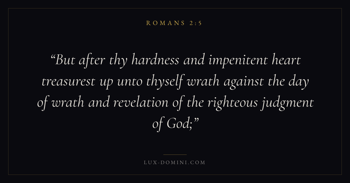 But after thy hardness and impenitent heart treasurest up unto thyself wrath against the day of wrath and revelation of the righteous judgment of God;