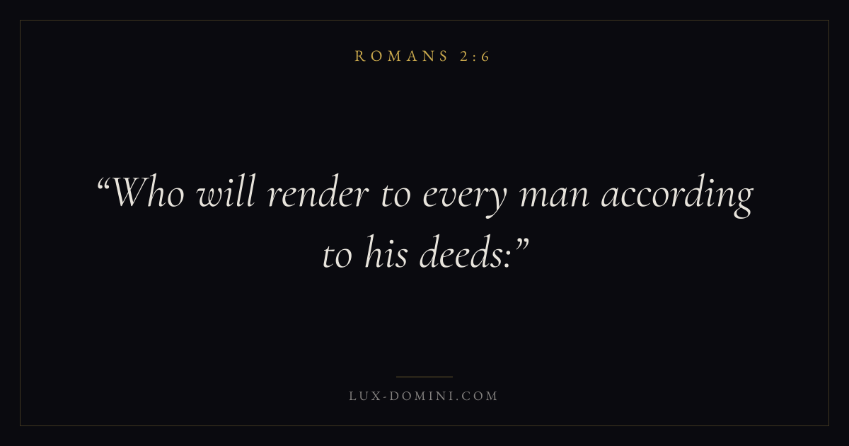 Books / Romans / Chapter 2 / Verse 6 ← Romans 2:5 Romans 2:6 Romans 2:7 → Who will render to every man according to his deeds: Download verse card Share on Twitter Share on Facebook Pin it ✦ Key themes FaithJustice and mercyGraceJustification Read with Romans 2:7Romans 2:8Hebrews 11:1Romans 10:17 Related topics Bible verses about faithBible verses about justice and mercyBible verses about grace ✦ Romans Chapter 2 verses V. 1 V. 2 V. 3 V. 4 V. 5 V. 6 V. 7 V. 8 V. 9 V. 10 V. 11 V. 12 V. 13 V. 14 V. 15 V. 16 V. 17 V. 18 V. 19 V. 20 V. 21 V. 22 V. 23 V. 24 V. 25 V. 26 V. 27 V. 28 V. 29