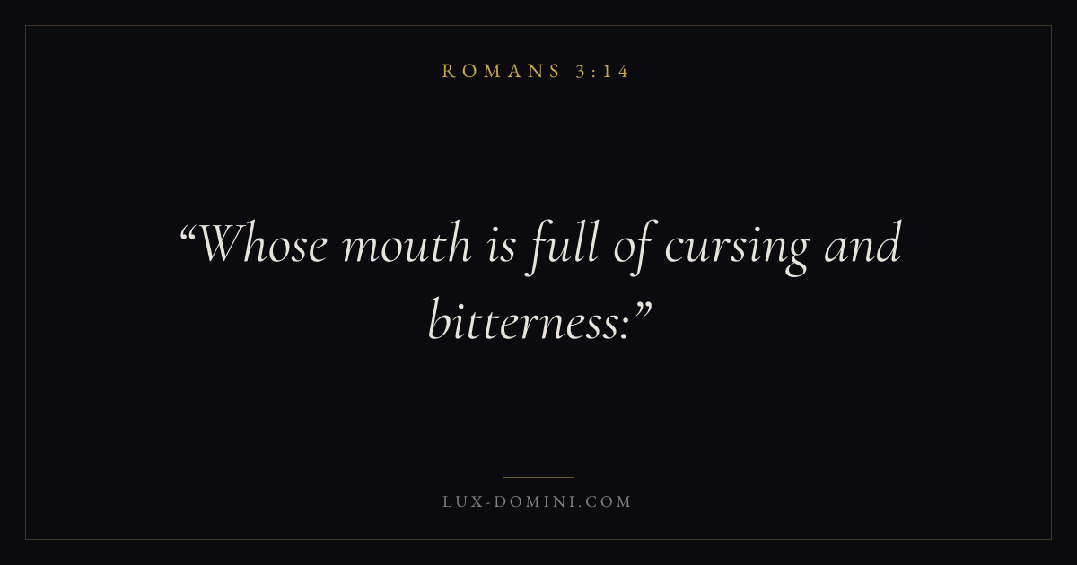 Books / Romans / Chapter 3 / Verse 14 ← Romans 3:13 Romans 3:14 Romans 3:15 → Whose mouth is full of cursing and bitterness: Download verse card Share on Twitter Share on Facebook Pin it ✦ Key themes FaithGraceJustificationSin Read with Romans 3:13Romans 3:15Hebrews 11:1Romans 10:17 Related topics Bible verses about faithBible verses about graceBible verses about sin ✦ Romans Chapter 3 verses V. 1 V. 2 V. 3 V. 4 V. 5 V. 6 V. 7 V. 8 V. 9 V. 10 V. 11 V. 12 V. 13 V. 14 V. 15 V. 16 V. 17 V. 18 V. 19 V. 20 V. 21 V. 22 V. 23 V. 24 V. 25 V. 26 V. 27 V. 28 V. 29 V. 30 V. 31