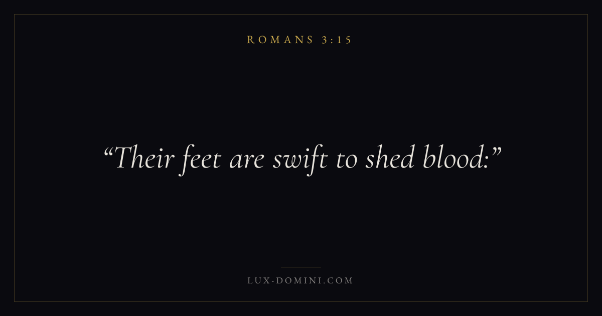 Books / Romans / Chapter 3 / Verse 15 ← Romans 3:14 Romans 3:15 Romans 3:16 → Their feet are swift to shed blood: Download verse card Share on Twitter Share on Facebook Pin it ✦ Key themes FaithGraceJustificationSin Read with Romans 3:13Romans 3:14Hebrews 11:1Romans 10:17 Related topics Bible verses about faithBible verses about graceBible verses about sin ✦ Romans Chapter 3 verses V. 1 V. 2 V. 3 V. 4 V. 5 V. 6 V. 7 V. 8 V. 9 V. 10 V. 11 V. 12 V. 13 V. 14 V. 15 V. 16 V. 17 V. 18 V. 19 V. 20 V. 21 V. 22 V. 23 V. 24 V. 25 V. 26 V. 27 V. 28 V. 29 V. 30 V. 31