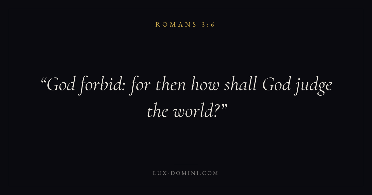 Books / Romans / Chapter 3 / Verse 6 ← Romans 3:5 Romans 3:6 Romans 3:7 → God forbid: for then how shall God judge the world? Download verse card Share on Twitter Share on Facebook Pin it ✦ Key themes FaithWisdomJustice and mercySalvationJustification Read with Romans 3:4Romans 3:5Hebrews 11:1Romans 10:17 Related topics Bible verses about faithBible verses about wisdomBible verses about justice and mercyBible verses about salvation ✦ Romans Chapter 3 verses V. 1 V. 2 V. 3 V. 4 V. 5 V. 6 V. 7 V. 8 V. 9 V. 10 V. 11 V. 12 V. 13 V. 14 V. 15 V. 16 V. 17 V. 18 V. 19 V. 20 V. 21 V. 22 V. 23 V. 24 V. 25 V. 26 V. 27 V. 28 V. 29 V. 30 V. 31