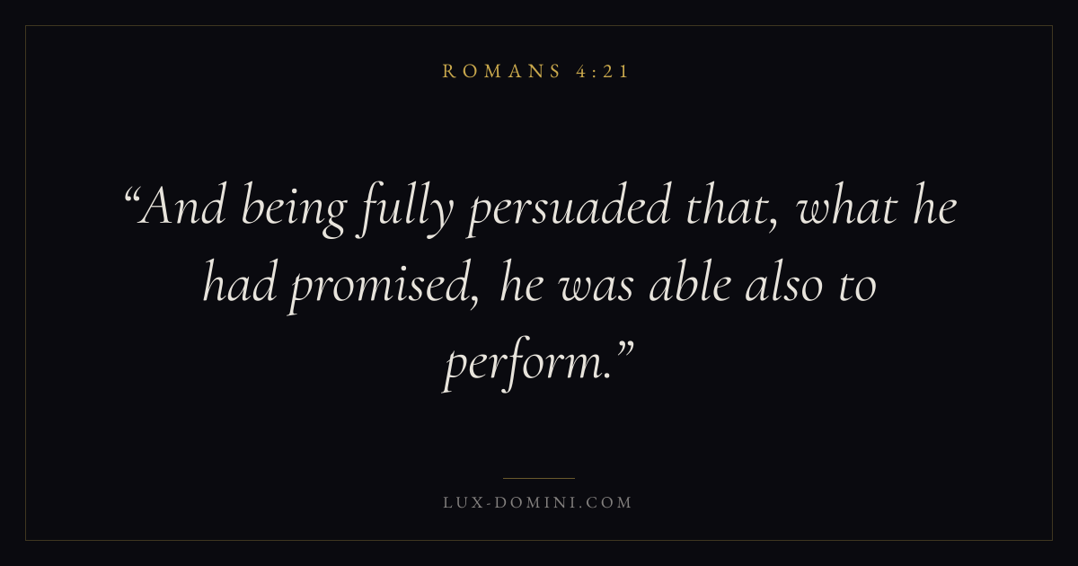 Books / Romans / Chapter 4 / Verse 21 ← Romans 4:20 Romans 4:21 Romans 4:22 → And being fully persuaded that, what he had promised, he was able also to perform. Download verse card Share on Twitter Share on Facebook Pin it ✦ Key themes FaithHopeGraceJustification Read with Romans 4:18Romans 4:19Hebrews 11:1Romans 10:17 Related topics Bible verses about faithBible verses about hopeBible verses about grace ✦ Romans Chapter 4 verses V. 1 V. 2 V. 3 V. 4 V. 5 V. 6 V. 7 V. 8 V. 9 V. 10 V. 11 V. 12 V. 13 V. 14 V. 15 V. 16 V. 17 V. 18 V. 19 V. 20 V. 21 V. 22 V. 23 V. 24 V. 25