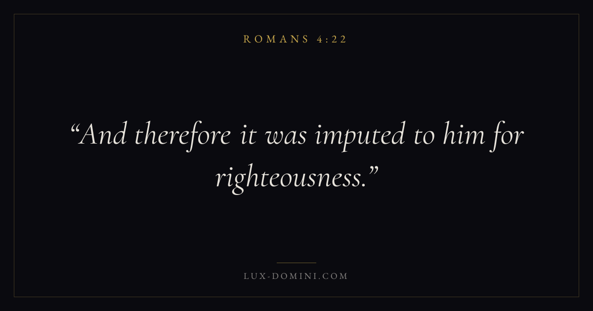 Books / Romans / Chapter 4 / Verse 22 ← Romans 4:21 Romans 4:22 Romans 4:23 → And therefore it was imputed to him for righteousness. Download verse card Share on Twitter Share on Facebook Pin it ✦ Key themes FaithHopeGraceJustification Read with Romans 4:18Romans 4:19Hebrews 11:1Romans 10:17 Related topics Bible verses about faithBible verses about hopeBible verses about grace ✦ Romans Chapter 4 verses V. 1 V. 2 V. 3 V. 4 V. 5 V. 6 V. 7 V. 8 V. 9 V. 10 V. 11 V. 12 V. 13 V. 14 V. 15 V. 16 V. 17 V. 18 V. 19 V. 20 V. 21 V. 22 V. 23 V. 24 V. 25