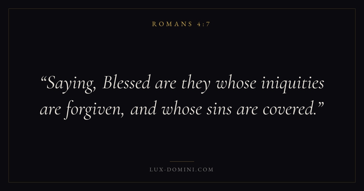 Books / Romans / Chapter 4 / Verse 7 ← Romans 4:6 Romans 4:7 Romans 4:8 → Saying, Blessed are they whose iniquities are forgiven, and whose sins are covered. Download verse card Share on Twitter Share on Facebook Pin it ✦ Key themes FaithForgivenessSalvationGraceJustification Read with Romans 4:6Hebrews 11:1Romans 10:17Ephesians 4:32 Related topics Bible verses about faithBible verses about forgivenessBible verses about salvationBible verses about grace ✦ Romans Chapter 4 verses V. 1 V. 2 V. 3 V. 4 V. 5 V. 6 V. 7 V. 8 V. 9 V. 10 V. 11 V. 12 V. 13 V. 14 V. 15 V. 16 V. 17 V. 18 V. 19 V. 20 V. 21 V. 22 V. 23 V. 24 V. 25
