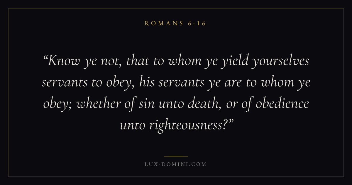 Know ye not, that to whom ye yield yourselves servants to obey, his servants ye are to whom ye obey; whether of sin unto death, or of obedience unto righteousness?