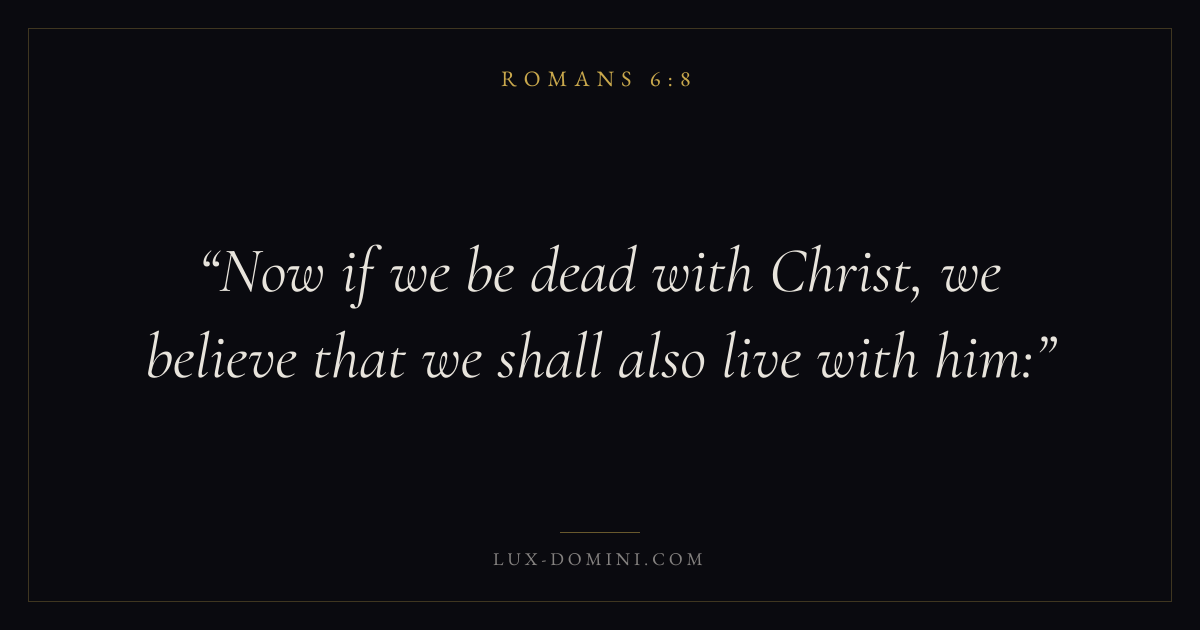 Books / Romans / Chapter 6 / Verse 8 ← Romans 6:7 Romans 6:8 Romans 6:9 → Now if we be dead with Christ, we believe that we shall also live with him: Download verse card Share on Twitter Share on Facebook Pin it ✦ Key themes FaithGraceJustificationSin Read with Romans 6:9Romans 6:10Hebrews 11:1Romans 10:17 Related topics Bible verses about faithBible verses about graceBible verses about sin ✦ Romans Chapter 6 verses V. 1 V. 2 V. 3 V. 4 V. 5 V. 6 V. 7 V. 8 V. 9 V. 10 V. 11 V. 12 V. 13 V. 14 V. 15 V. 16 V. 17 V. 18 V. 19 V. 20 V. 21 V. 22 V. 23