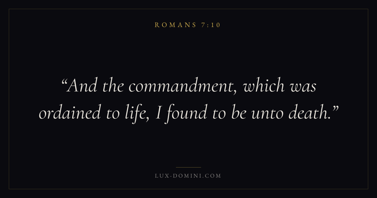 Books / Romans / Chapter 7 / Verse 10 ← Romans 7:9 Romans 7:10 Romans 7:11 → And the commandment, which was ordained to life, I found to be unto death. Download verse card Share on Twitter Share on Facebook Pin it ✦ Key themes FaithWisdomForgivenessPeaceJustification Read with Romans 7:7Romans 7:8Hebrews 11:1Romans 10:17 Related topics Bible verses about faithBible verses about wisdomBible verses about forgivenessBible verses about peace ✦ Romans Chapter 7 verses V. 1 V. 2 V. 3 V. 4 V. 5 V. 6 V. 7 V. 8 V. 9 V. 10 V. 11 V. 12 V. 13 V. 14 V. 15 V. 16 V. 17 V. 18 V. 19 V. 20 V. 21 V. 22 V. 23 V. 24 V. 25