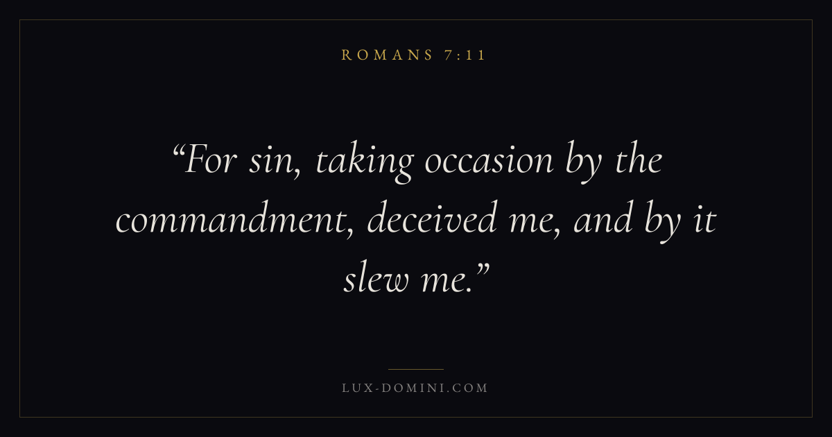 Books / Romans / Chapter 7 / Verse 11 ← Romans 7:10 Romans 7:11 Romans 7:12 → For sin, taking occasion by the commandment, deceived me, and by it slew me. Download verse card Share on Twitter Share on Facebook Pin it ✦ Key themes FaithWisdomForgivenessPeaceJustification Read with Romans 7:7Romans 7:8Hebrews 11:1Romans 10:17 Related topics Bible verses about faithBible verses about wisdomBible verses about forgivenessBible verses about peace ✦ Romans Chapter 7 verses V. 1 V. 2 V. 3 V. 4 V. 5 V. 6 V. 7 V. 8 V. 9 V. 10 V. 11 V. 12 V. 13 V. 14 V. 15 V. 16 V. 17 V. 18 V. 19 V. 20 V. 21 V. 22 V. 23 V. 24 V. 25