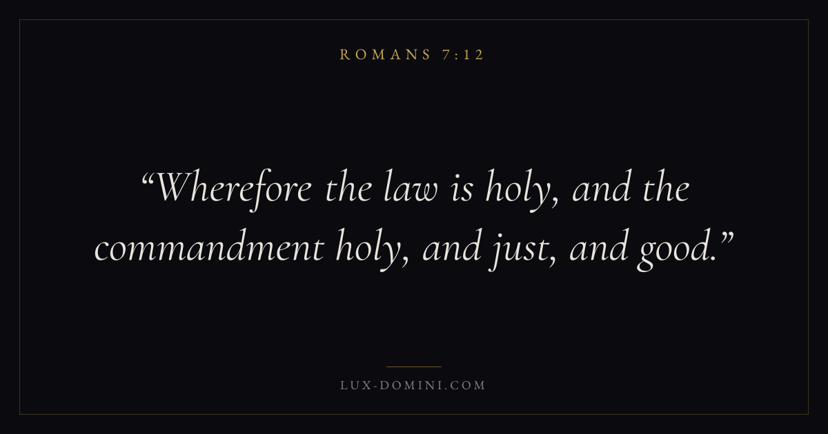 Books / Romans / Chapter 7 / Verse 12 ← Romans 7:11 Romans 7:12 Romans 7:13 → Wherefore the law is holy, and the commandment holy, and just, and good. Download verse card Share on Twitter Share on Facebook Pin it ✦ Key themes FaithWisdomForgivenessPeaceJustification Read with Romans 7:13Romans 7:14Hebrews 11:1Romans 10:17 Related topics Bible verses about faithBible verses about wisdomBible verses about forgivenessBible verses about peace ✦ Romans Chapter 7 verses V. 1 V. 2 V. 3 V. 4 V. 5 V. 6 V. 7 V. 8 V. 9 V. 10 V. 11 V. 12 V. 13 V. 14 V. 15 V. 16 V. 17 V. 18 V. 19 V. 20 V. 21 V. 22 V. 23 V. 24 V. 25