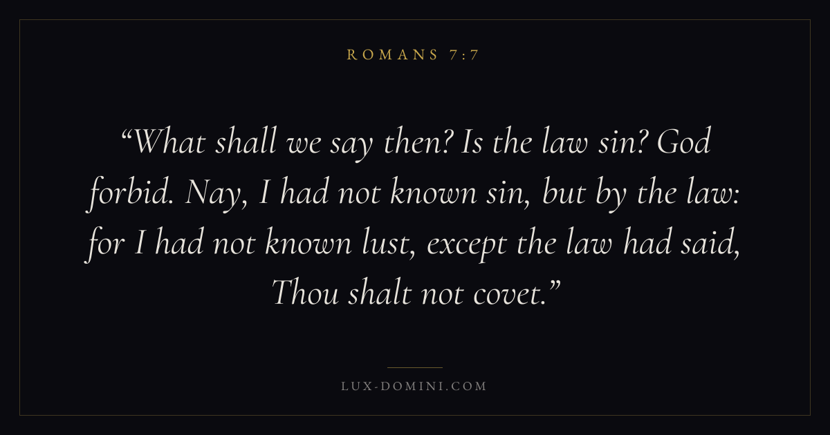 What shall we say then? Is the law sin? God forbid. Nay, I had not known sin, but by the law: for I had not known lust, except the law had said, Thou shalt not covet.