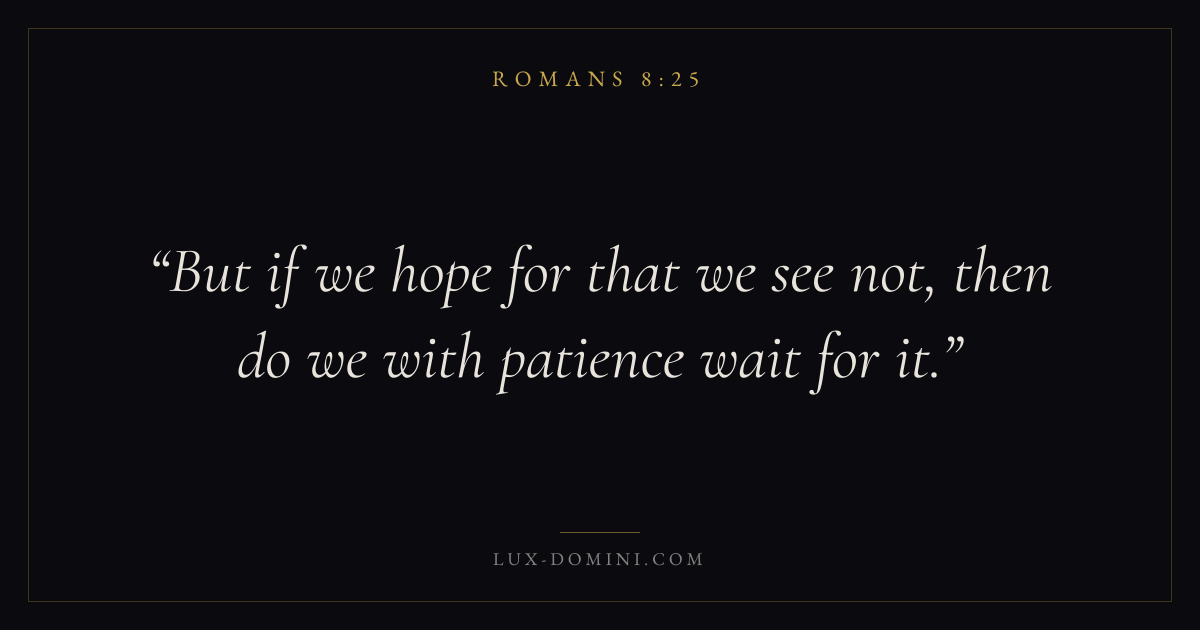 Books / Romans / Chapter 8 / Verse 25 ← Romans 8:24 Romans 8:25 Romans 8:26 → But if we hope for that we see not, then do we with patience wait for it. Download verse card Share on Twitter Share on Facebook Pin it ✦ Key themes FaithHopeGraceTruthJustification Read with Romans 8:23Romans 8:24Hebrews 11:1Romans 10:17 Related topics Bible verses about faithBible verses about hopeBible verses about graceBible verses about truth ✦ Romans Chapter 8 verses V. 1 V. 2 V. 3 V. 4 V. 5 V. 6 V. 7 V. 8 V. 9 V. 10 V. 11 V. 12 V. 13 V. 14 V. 15 V. 16 V. 17 V. 18 V. 19 V. 20 V. 21 V. 22 V. 23 V. 24 V. 25 V. 26 V. 27 V. 28 V. 29 V. 30 V. 31 V. 32 V. 33 V. 34 V. 35 V. 36 V. 37 V. 38 V. 39