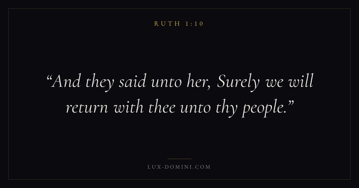Books / Ruth / Chapter 1 / Verse 10 ← Ruth 1:9 Ruth 1:10 Ruth 1:11 → And they said unto her, Surely we will return with thee unto thy people. Download verse card Share on Twitter Share on Facebook Pin it ✦ Key themes HopeHesedProvidenceLoyalty Read with Ruth 1:9Ruth 1:11Romans 8:24Revelation 21:4 Related topics Bible verses about hopeBible verses about trusting God ✦ Ruth Chapter 1 verses V. 1 V. 2 V. 3 V. 4 V. 5 V. 6 V. 7 V. 8 V. 9 V. 10 V. 11 V. 12 V. 13 V. 14 V. 15 V. 16 V. 17 V. 18 V. 19 V. 20 V. 21 V. 22