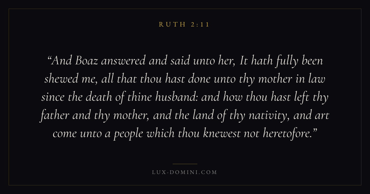 And Boaz answered and said unto her, It hath fully been shewed me, all that thou hast done unto thy mother in law since the death of thine husband: and how thou hast left thy father and thy mother, and the land of thy nativity, and art come unto a people which thou knewest not heretofore.