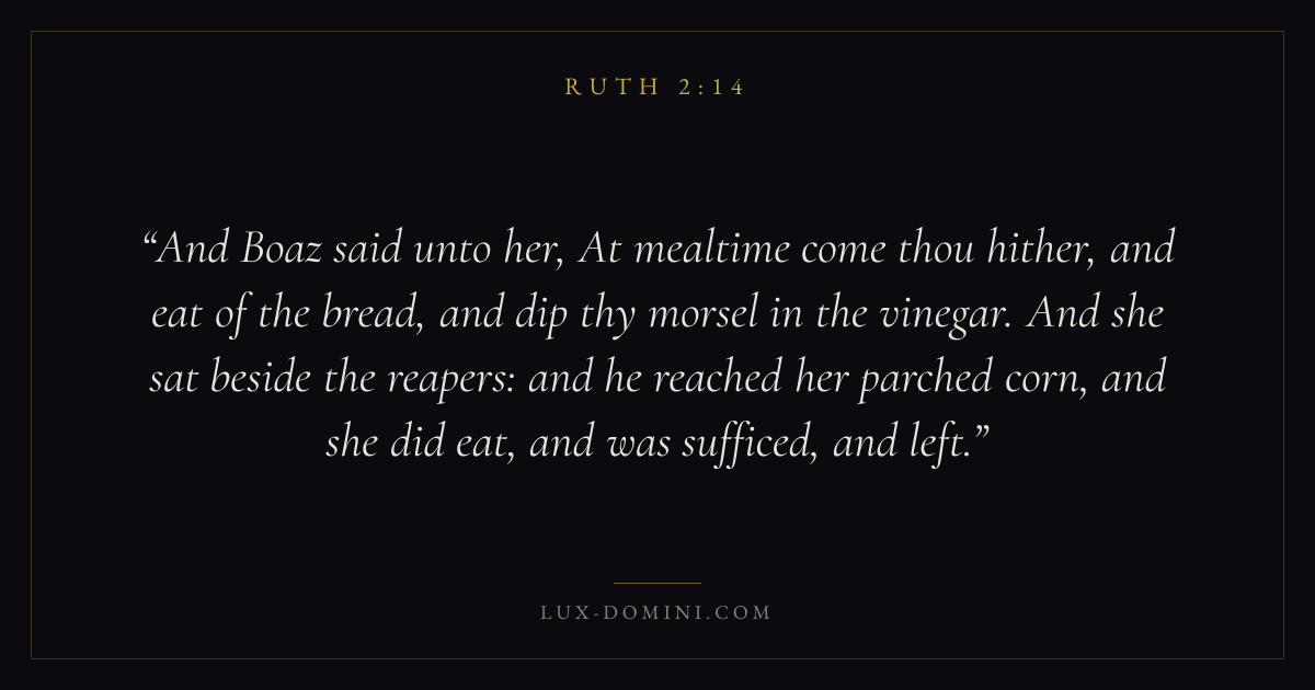 And Boaz said unto her, At mealtime come thou hither, and eat of the bread, and dip thy morsel in the vinegar. And she sat beside the reapers: and he reached her parched corn, and she did eat, and was sufficed, and left.